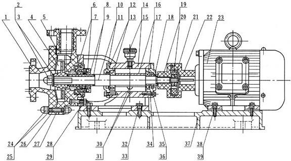6、如果更換滾珠軸承或泵軸時,必須折下機(jī)架,松開前端軸承蓋4只螺釘,折下泵軸后端園螺母和聯(lián)軸節(jié),將泵軸向前端方向打出即可,再后折下后端軸封蓋。